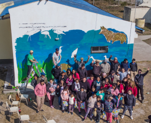 En ese espacio se hizo un mural colectivo inspirado en la fauna y en la laguna cercana. Quedó grabado en una de las paredes, como una especie de recordatorio de que la escuela también forma parte del paisaje.